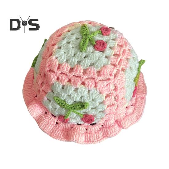 Мультяшная шерстяная шапка с аппликацией из вишни, вязаная шапка, детский головной убор цвета конфет, детская шляпа-ведро, детская вязаная шапка для фотосъемки, дни рождения, вечеринки на открытом воздухе, кепка розовый