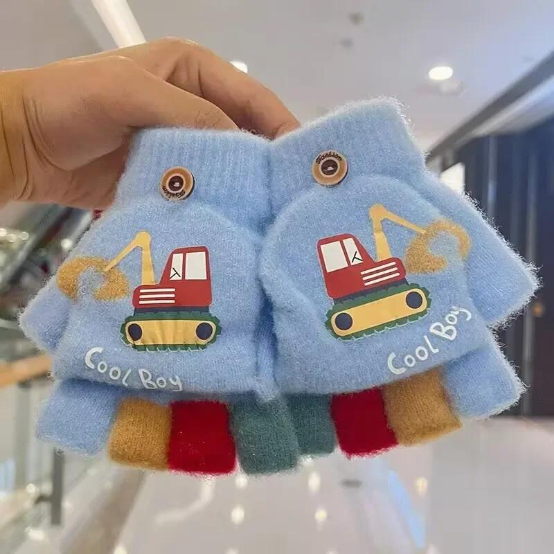 Мультяшные зимние перчатки для мальчика, милые экскаваторные толстые теплые детские варежки с полупальцами, ветрозащитные детские перчатки для отдыха на природе