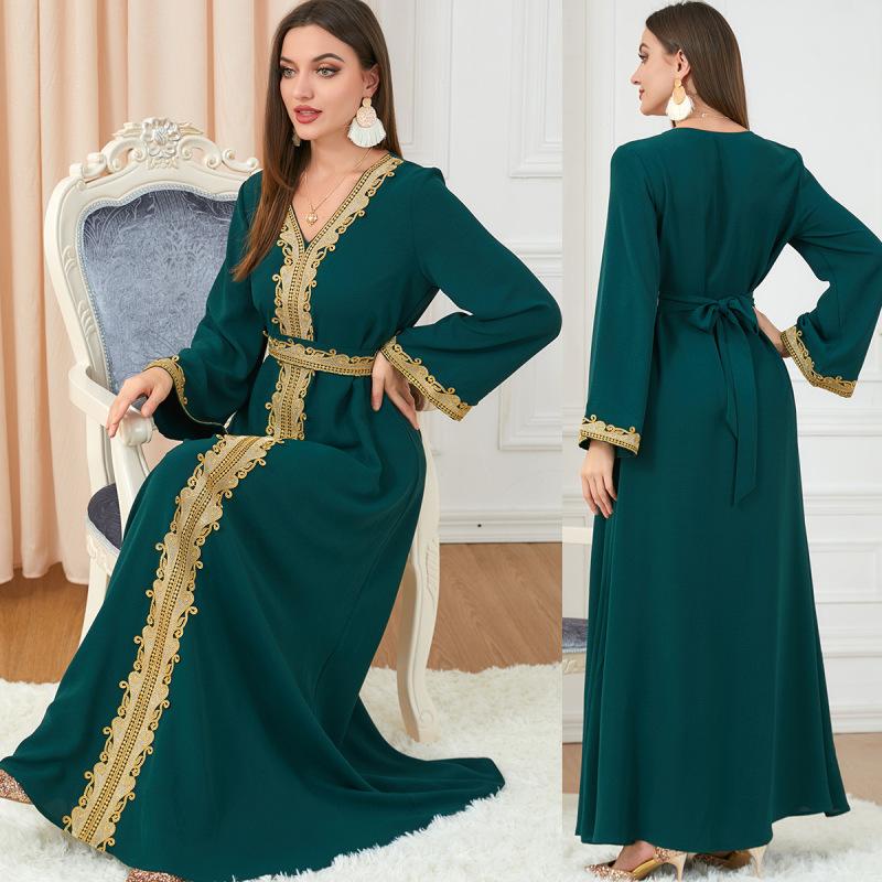 Мусульманское женское кружевное платье с v-образным вырезом и длинными рукавами и длинными рукавами, длинное платье с поясом, платье для одежды, осеннее женское длинное платье с длинными рукавами