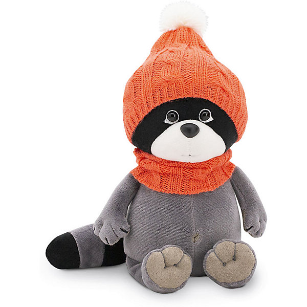 Забавный мягкий енотик с милыми глазками одет в тёплую вязаную шапочку и снуд. Игрушка изготовлена из качественных материалов.