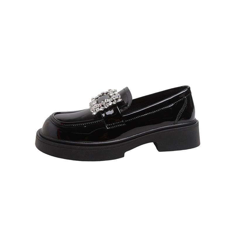 Мягкая кожаная версия лакированные кожаные туфли на платформе женские осень и зима новые стразы квадратная пряжка круглая головка британский толстый каблук маленькая кожа 40 чёрный