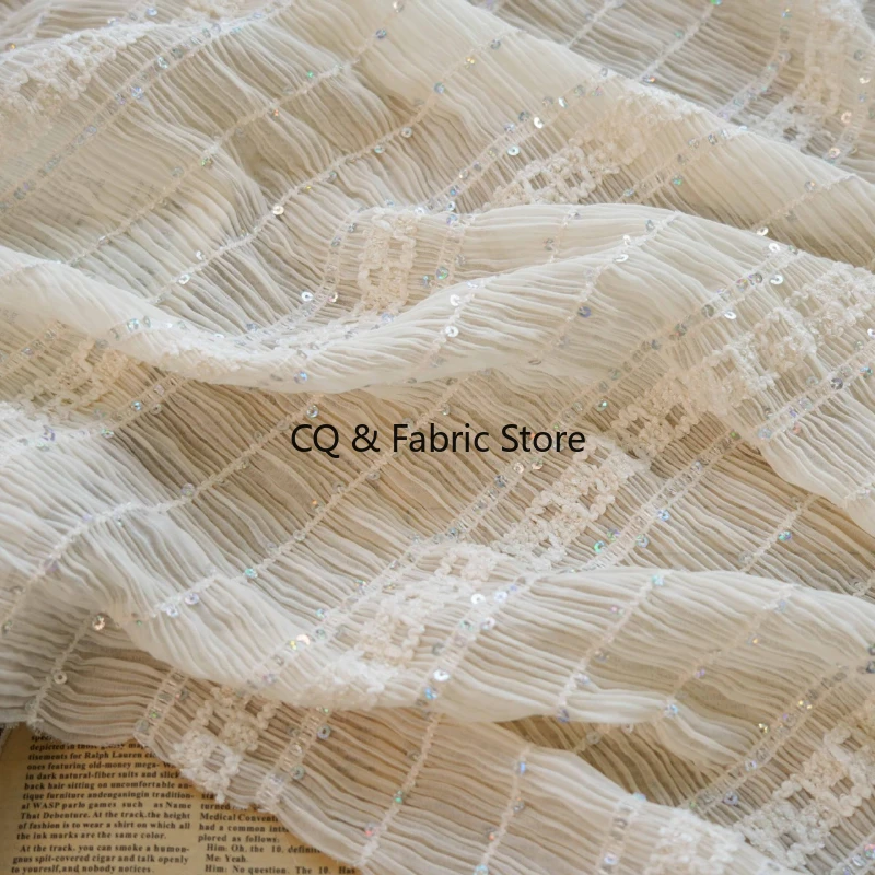 Мягкая эластичная шифоновая ткань с рюшами и прозрачными блестками белого цвета для бального платья, мини-платья, праздничного платья, одежды