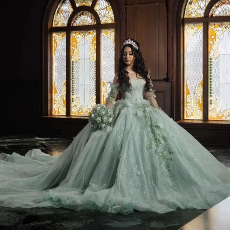Мятно-зеленые блестящие платья Quinceanera с открытыми плечами, аппликация, кружево, бисер, кристалл, тюль, корсет, вечерние, день рождения, милое платье 16,