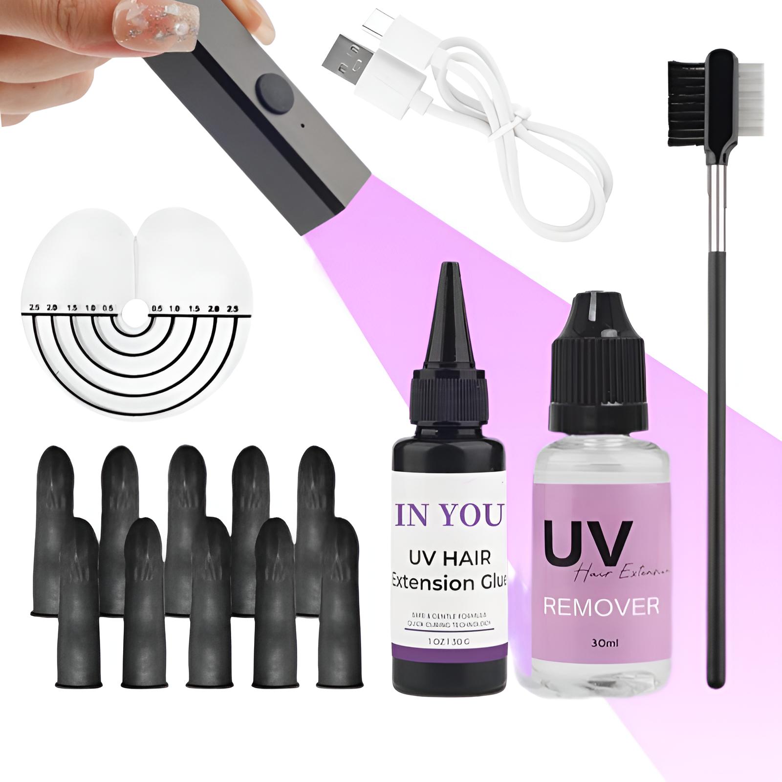 Набор для волос Salon Pro UV: УФ-лампа + 30 г клея и средство для снятия расчески, 10-секундная быстрая полимеризация, долговечность, салонное и домашнее использование A set