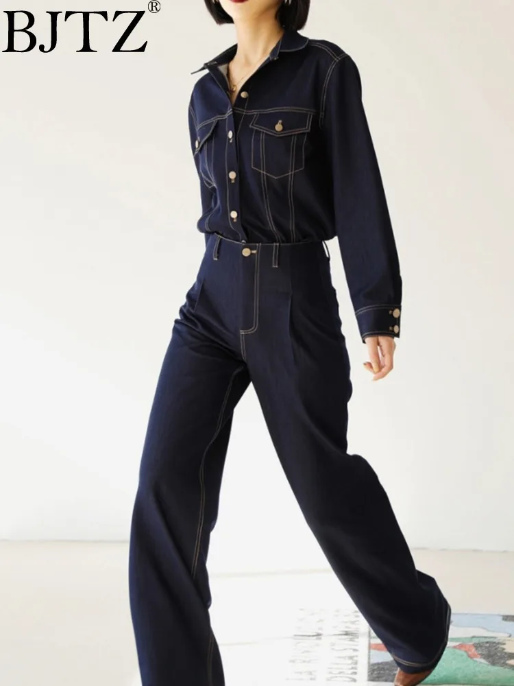 BJTZ Джинсовая рубашка в стиле ретро с высокой талией и широкими штанинами, яркая нить, свободный комплект из двух предметов для женщин, весна-осень 2024, модные новые женские комплекты
