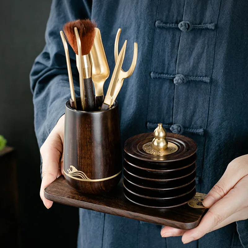 Набор для чайной церемонии из шести предметов, из черного дерева, чайная утварь для кунг-фу, зажим для чая из нержавеющей стали, держатель для ручки, коврик для чайной чашки, ситечко, подставки