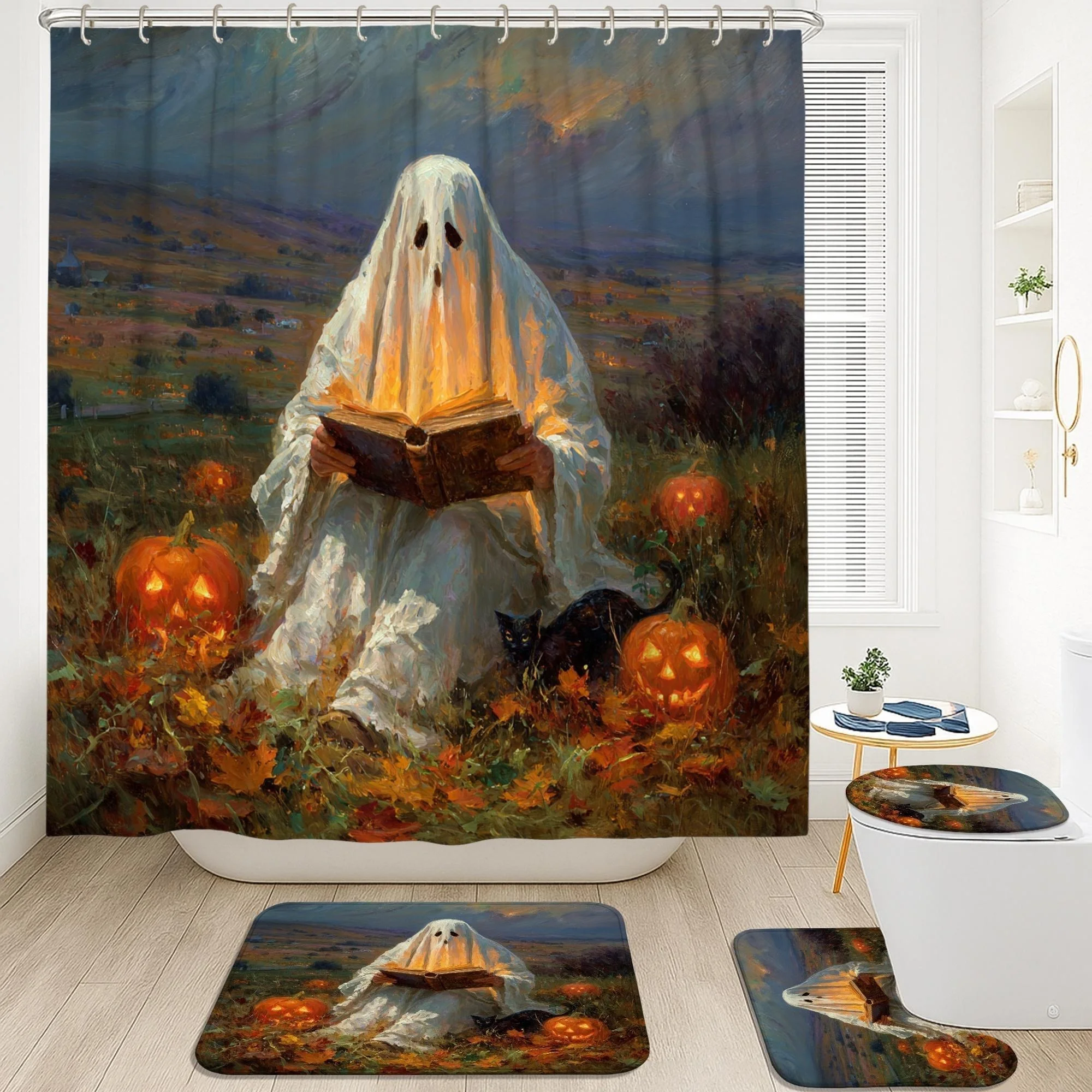 Набор из 4 занавесок для душа на Хэллоуин с белым и черным дизайном тыквы — жуткая осенняя полиэфирная ткань, можно стирать в машине,