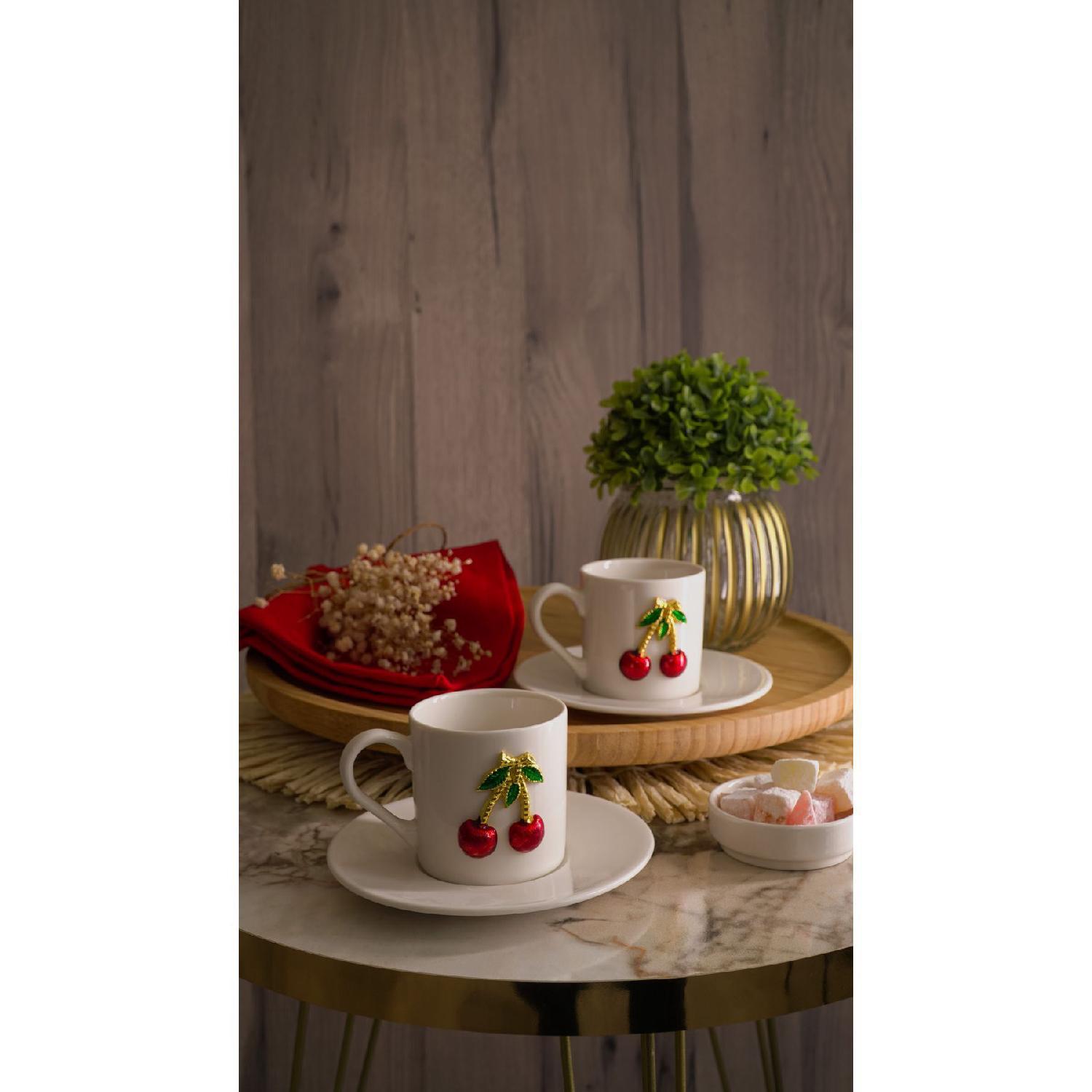 Набор из 4 фарфоровых кофейных чашек с вишней на 2 персоны, 100 мл - Кофейная чашка с вишней белый