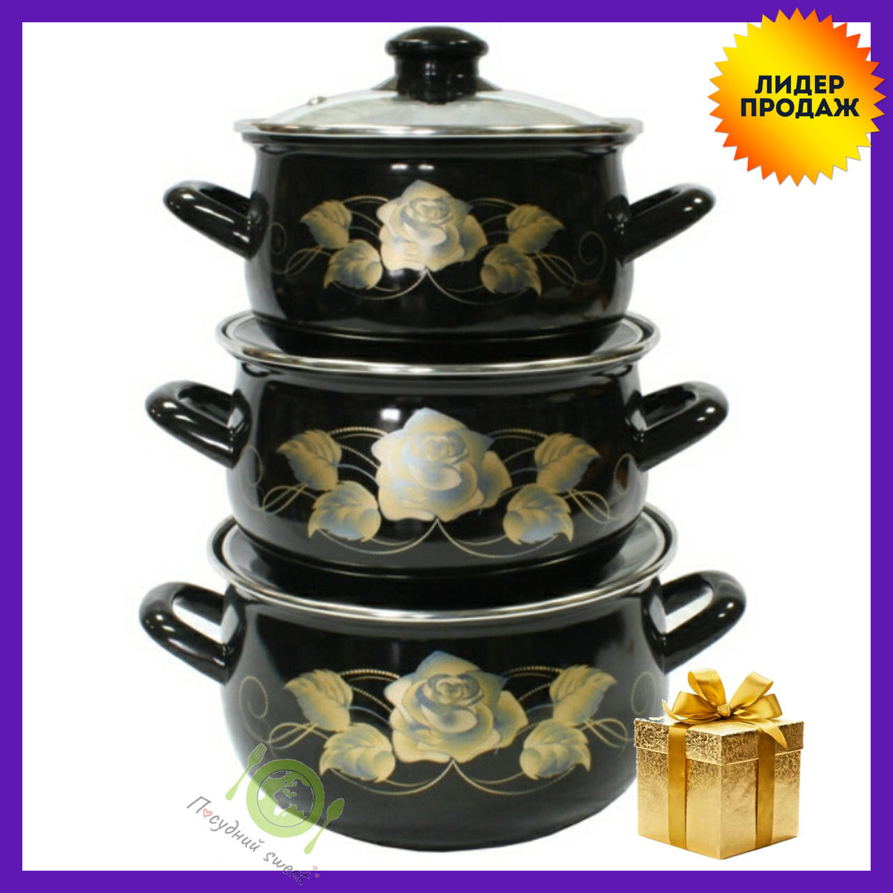 Набор кастрюль эмалированных Interos Золотая Роза 3 пр 3040 А / Набір каструль емальованих Золота Троянда