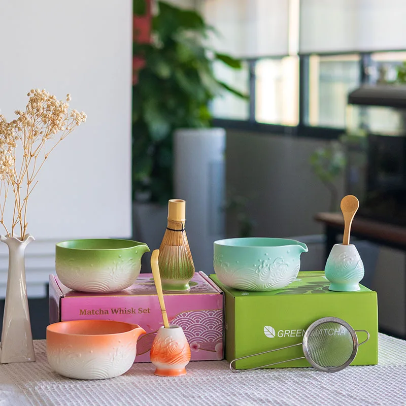 Набор матча из 4/5/6/7/8 предметов, молочно-желтые чаши с градиентом зеленого матча, бамбуковый венчик (Chasen) и держатель, японская чайная церемония