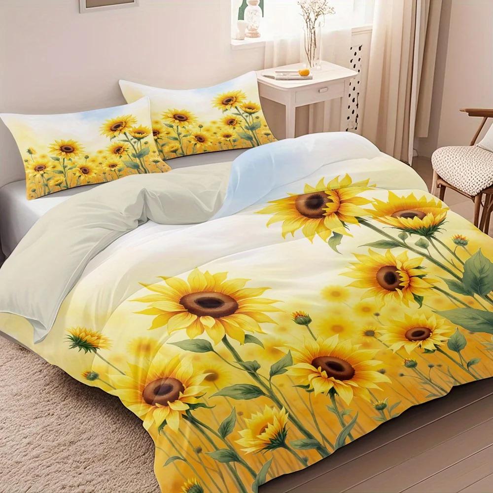 Набор стеганого одеяла с принтом «Иллюстрация подсолнечного поля» из 3 предметов - Включает 1 пододеяльник и 2 наволочки (без наполнителя) 135x200cm