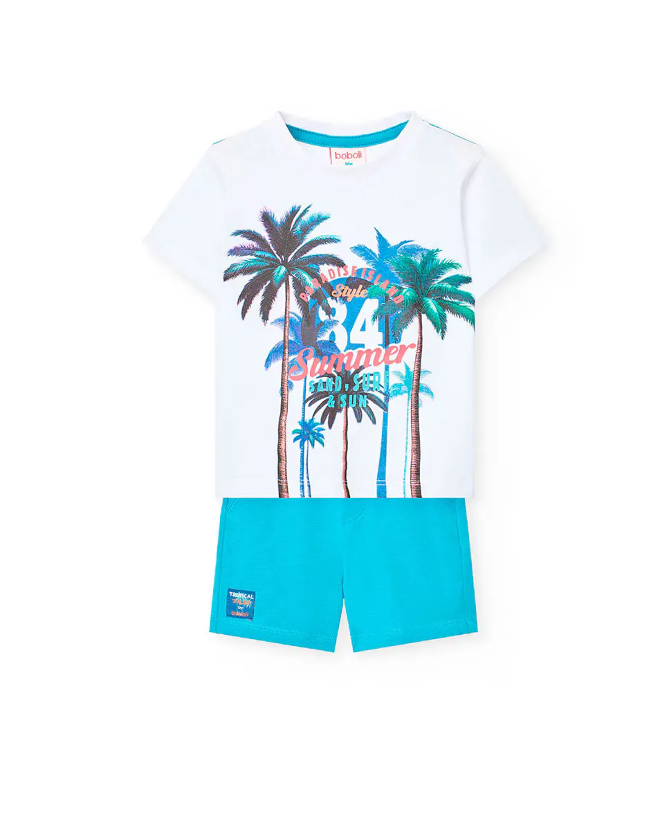Комплект футболки для мальчика с рисунком спереди и однотонных бермудских шорт Boboli, белый