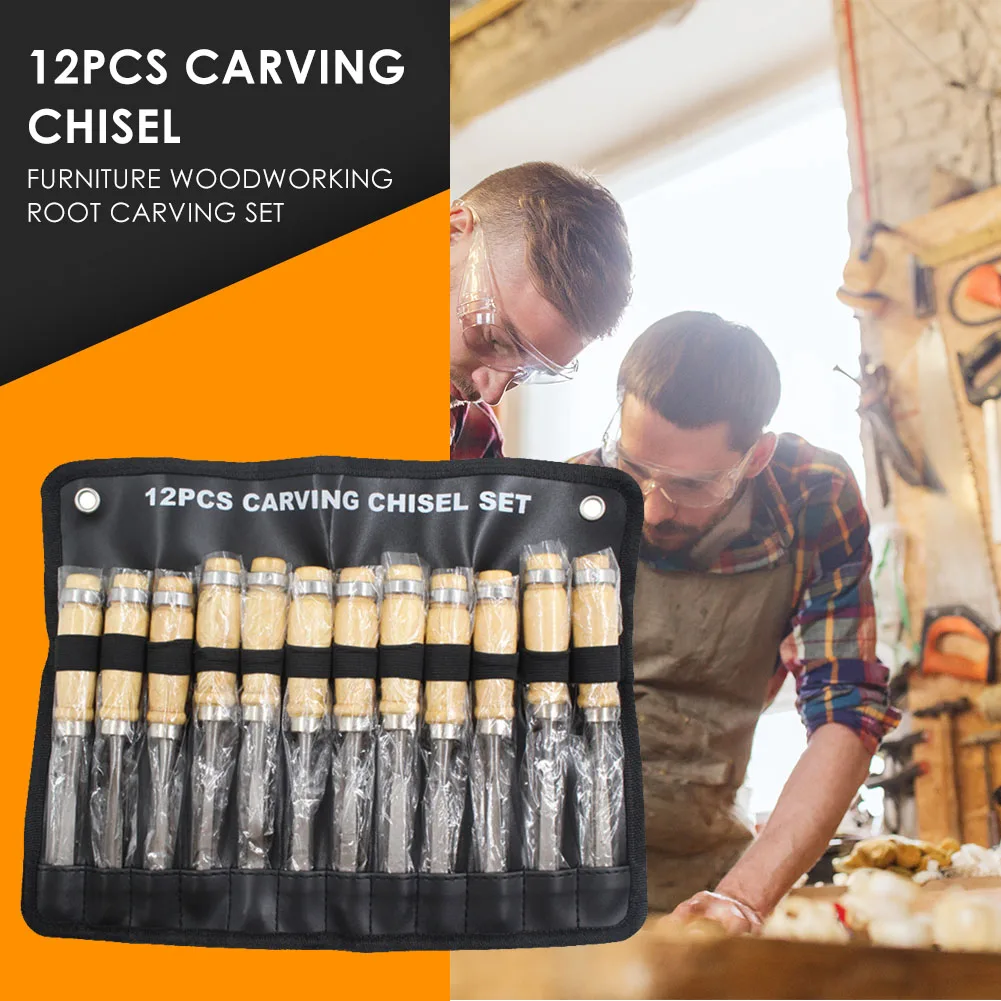 Screws Nails Drill Bit Metal Parts Pouch 12pcs Woodworking Carpenter Hand Chisel Wood Carving Chisels Engraving Tool Set