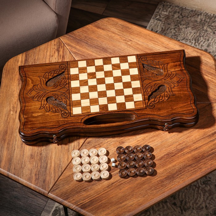 Нарды ручной работы - это классическая настольная игра, проверенная веками. Каждые нарды выполнены мастерами в ручную из высококачественного массива ореха.Верхняя внешняя часть доски украшена резным узором. На нижней части доски расположено шахматное поле и обрамлено резным узором. В комплект входят фишки для шашек.С внутренней стороны доска полностью оформлена под поле для игры в нарды. Фишки вырезаны в ручную, и имеют тканное основание для легкого скольжения по полю.Для износостойкости и долговечности изделие покрыто защитным лаком.
