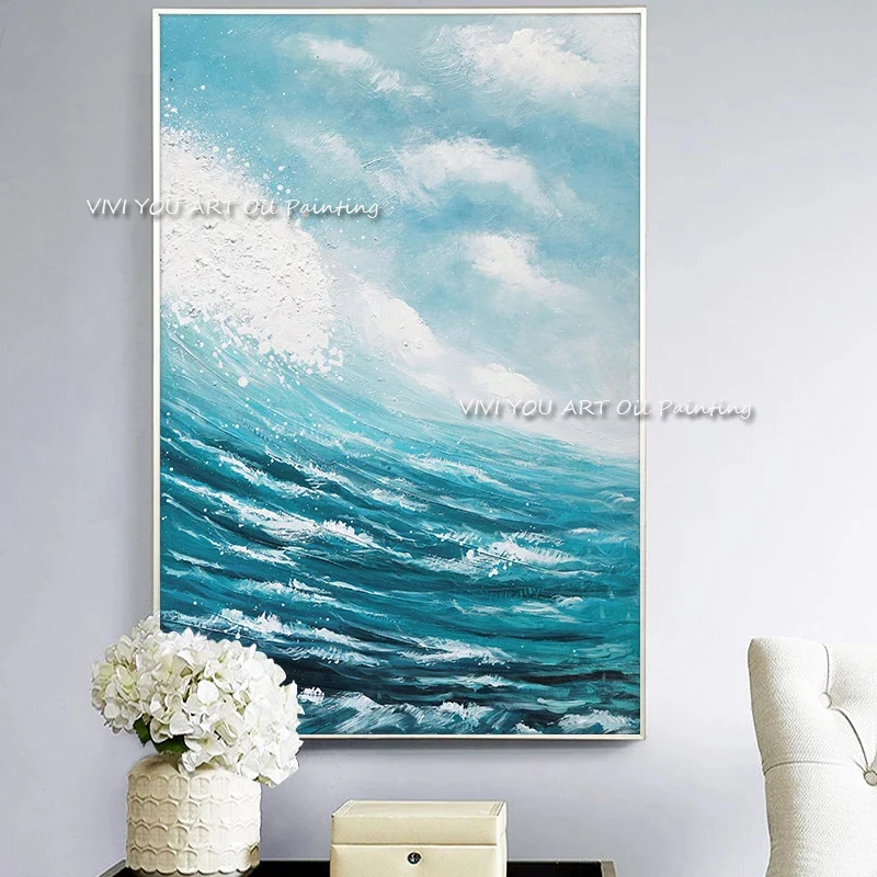 Настенная живопись, ручная роспись, морская волна, синий и белый цвета, Современная Большая абстрактная картина маслом, холст, картина для г...