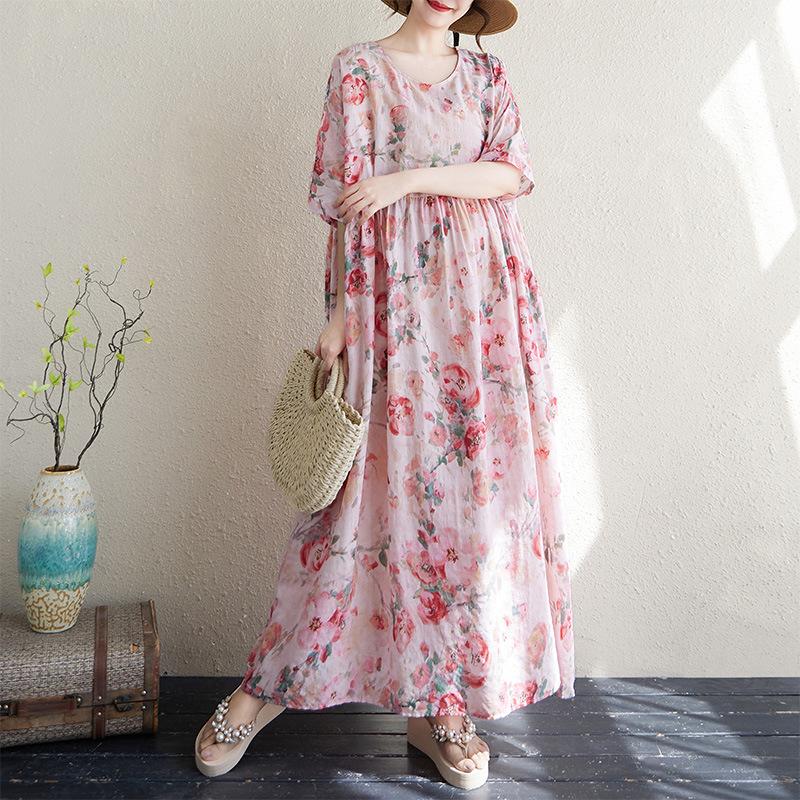 Настоящее лето новая тонкая хлопково-льняная круглошеяя короткорукавная розовая богемная миди и длинное платье для внешней торговли женское Large size average size розовый
