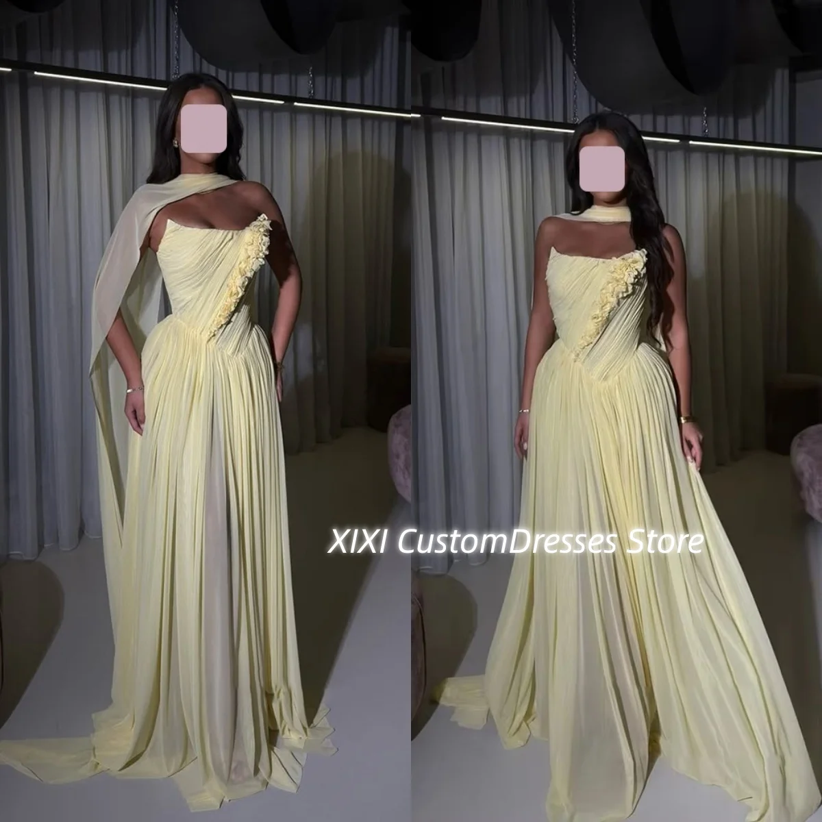Настройте платье трапециевидной формы длиной до пола без бретелек для выпускного вечера с рюшами Желтые платья без рукавов на молнии для специальных мероприятий