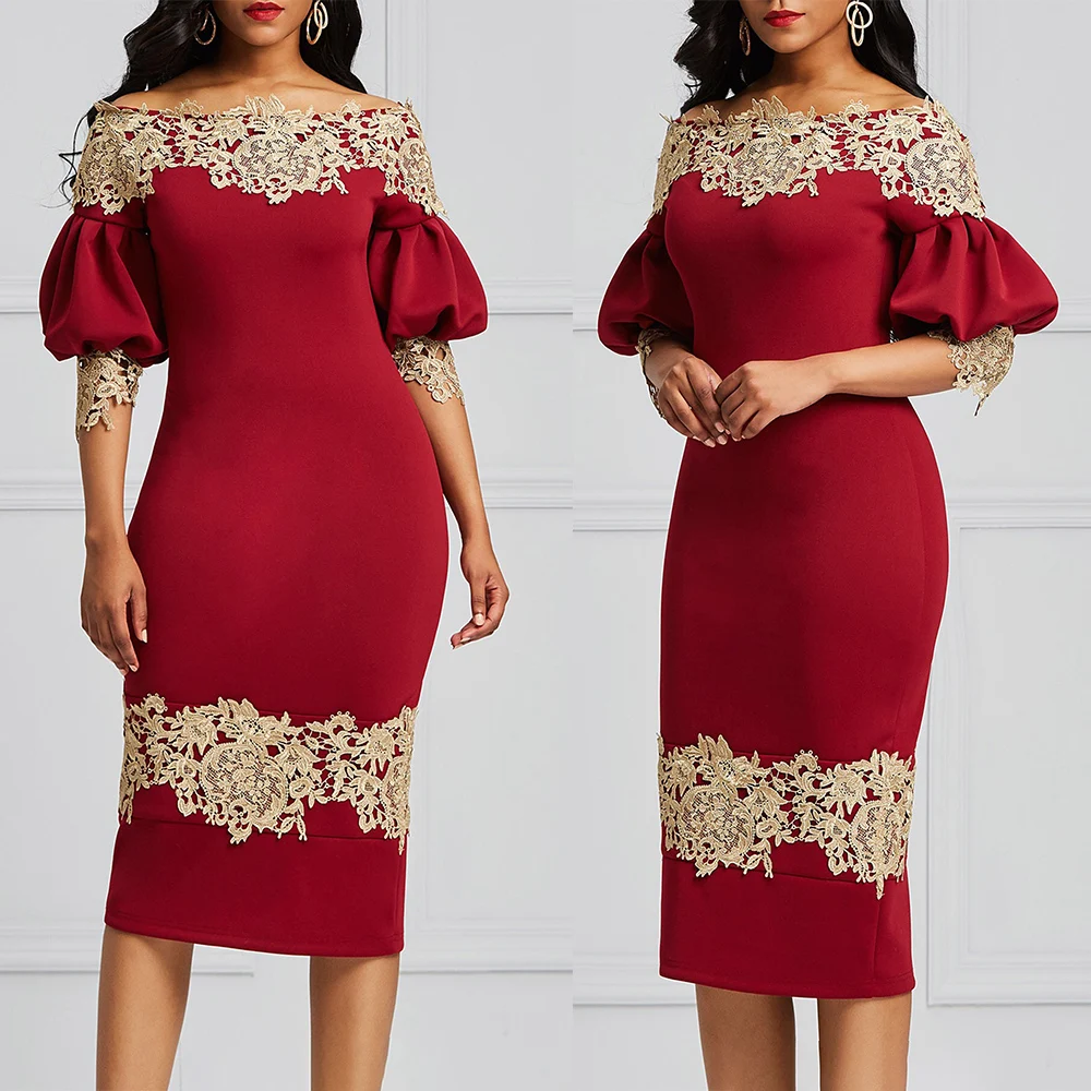 Embroidered Women's Dress Off-the-Shoulder Boat Neck Vintage Femme Elegant Dress Lantern Sleeve Lace Stitching Dress D30