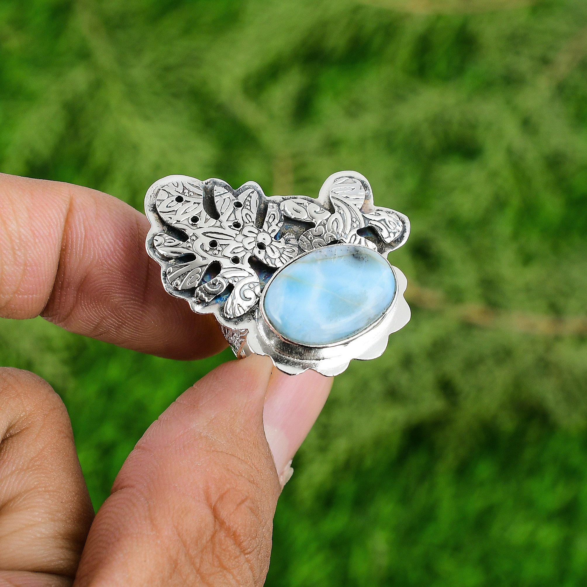 Натуральный Ларимар Драгоценный камень Солитер Синее Регулируемое Кольцо 925 Стерлинговое Серебро Adjustable