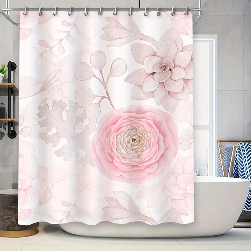 Нежная розовая цветочная шторка для душа Декоративный акварельный принт для ванной комнаты Полиэстеровая ткань с кольцами Доступны различные размеры 90x180cm