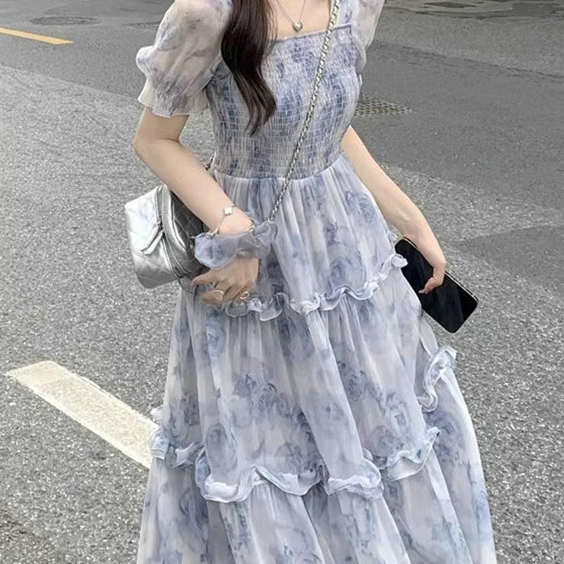 Нежный стиль чай французская длинная юбка 2025 лето темперамент талия квадратный вырез цветочный платье девушка CH-307 S