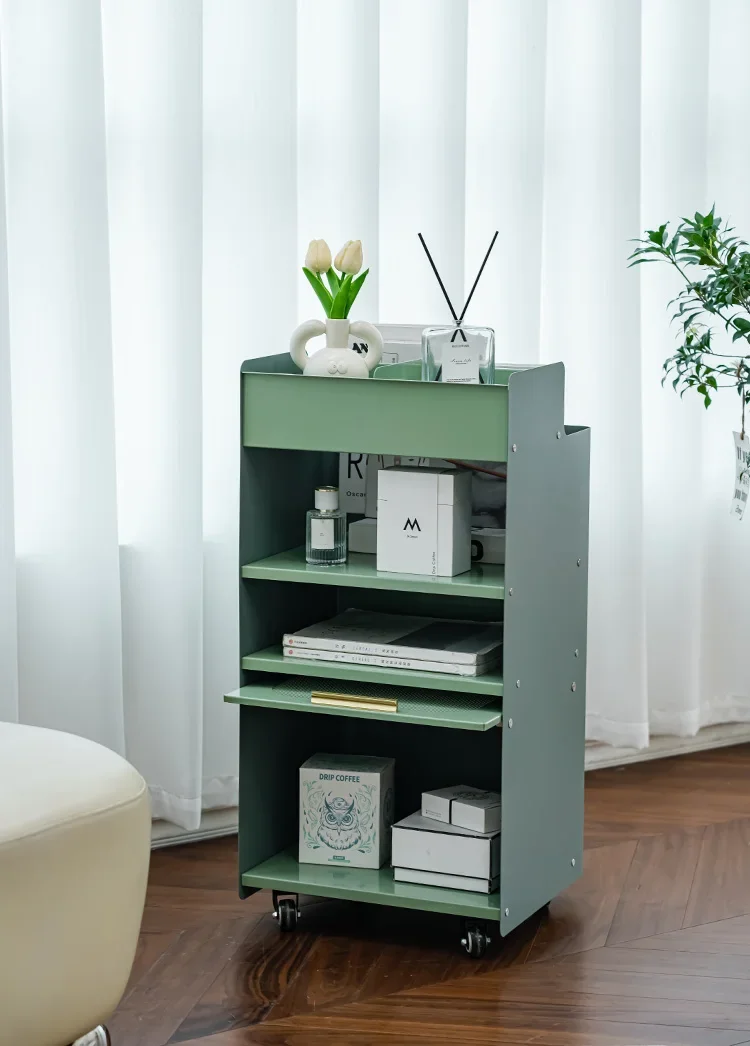 Несколько современных бытовых шкафчиков на стороне дивана, простая гостиная, небольшой журнальный столик, уголок для хранения в спальне.