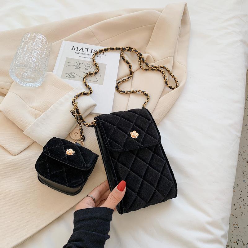 Нишевая дизайнерская сумка женская 2025 осень и зима новая бархатная сумка для мобильного телефона и помады модная модная цепочка на плечо сумка-мессенджер чёрный