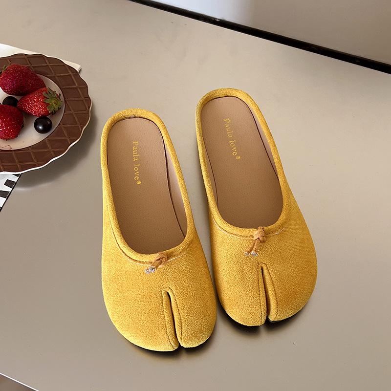 Нишевая ретро-туфля с раздвоенным носком для девочек 2024 года, новые замшевые вечерние туфли-свиные ножки с мягкой подошвой, полутапочки с принтом «мешок на голове», туфли-лодочки 36 жёлтый