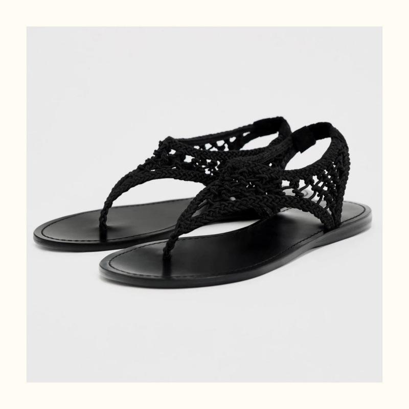 Нишевые летние новые шлепанцы с защемлением пальцев, ручной вязки, на плоской подошве, с одним ремешком, прохладные тапочки с открытым носком, черные сетчатые ажурные сандалии женские 35 чёрный