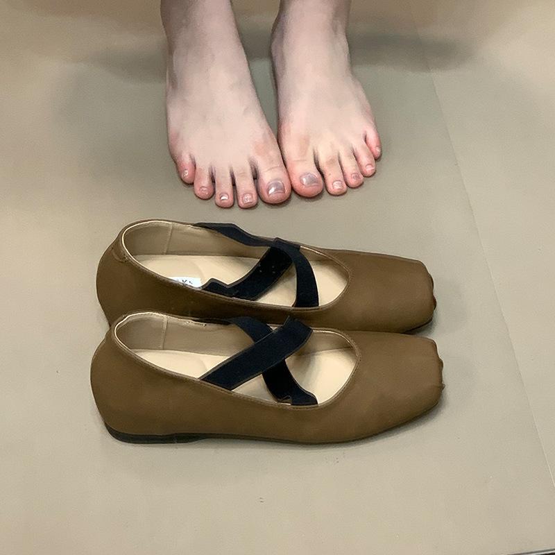 Нишевые ретро балетки с перекрестными ремешками 2025 осень новая внутренняя высота увеличение квадратный носок мелкий вырез Мэри Джейн одинарная обувь женская 40 коричневый
