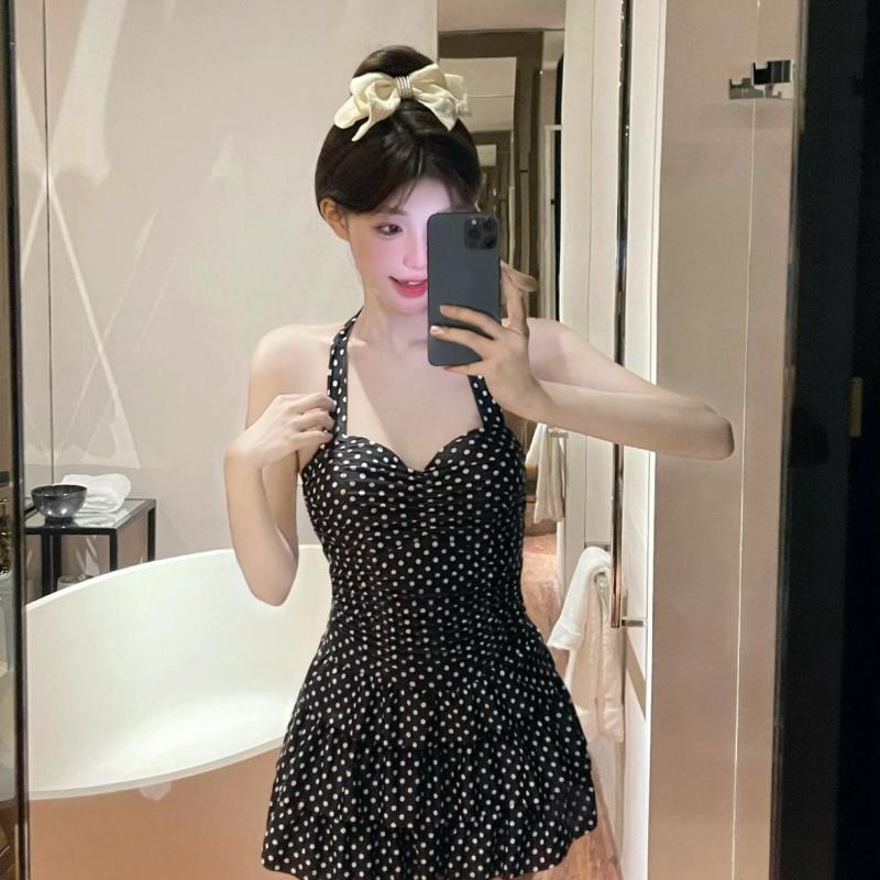 Новая Мода Цельный Купальник с Подтяжками в Горошек Делает Стройнее Сборка Купальник для Горячих Источников XL чёрный