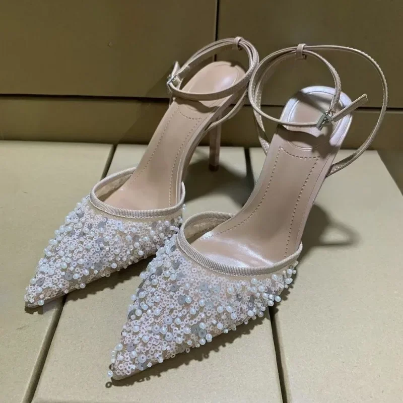 Designer High Heels Summer Sandals for Women Glitter Sequins Pearl Mesh Elegant Party Bridal Wedding Shoes Ankle Strap Stiletto