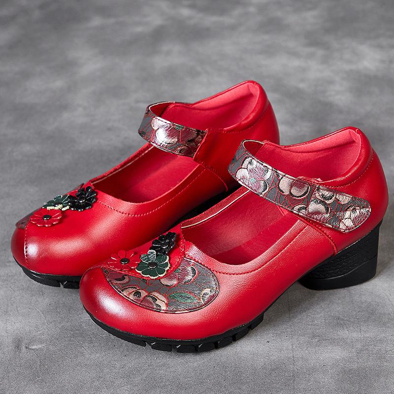 Новая весенне-осенняя женская обувь первый слой коровьей кожи толстый каблук мягкая подошва одинарная обувь женская мать мелкий вырез на липучке маленькие кожаные туфли 34 красный