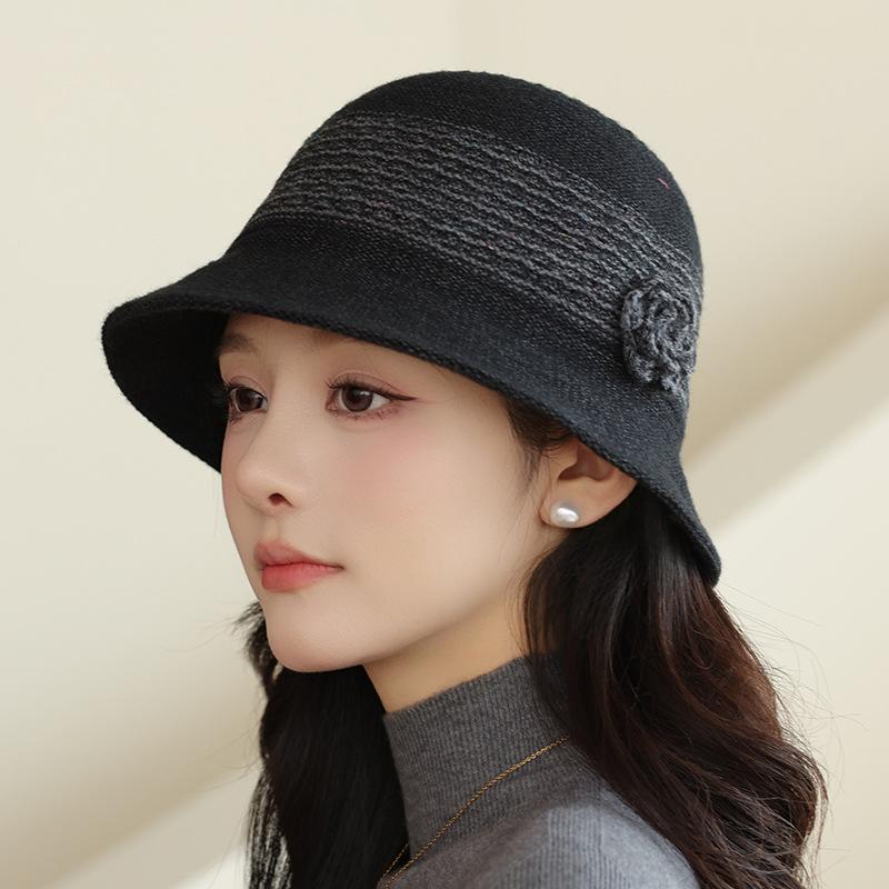Новая вязаная панама женская осенне-зимняя теплая с защитой ушей модная с цветком элегантная шляпа-ведро для мамы one size чёрный