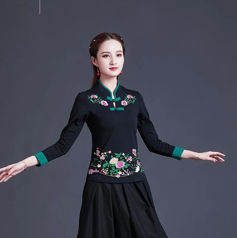 Cheongsam Top Traditional Chinese Clothes For Women Long Sleeve Shirt Cotton Vintage Clothing Top Tee Blouse Shirt KK3682