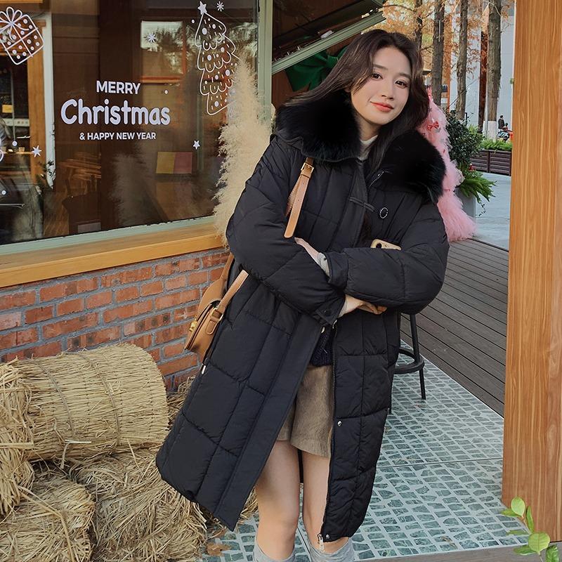 Новая зимняя куртка 2024 года из хлопка-пуховика для женщин, средняя длина, меховой воротник, шаль, утягивающая талия, модная утолщенная куртка средней длины XXXL чёрный