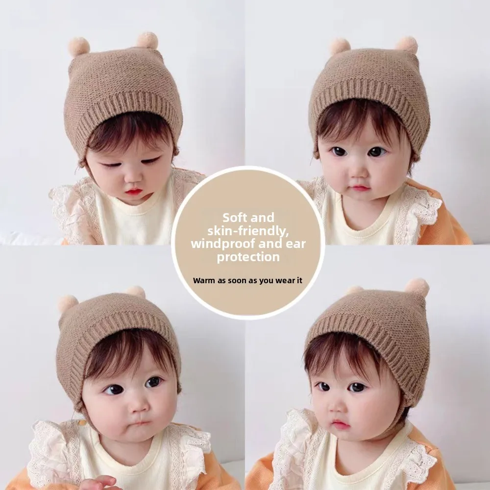 Новая корейская детская шапка для защиты ушей от 2 до 24 месяцев, зимняя теплая шапка для младенцев, шерстяная вязаная крючком вязаная шапка с двойным шариком для малышей