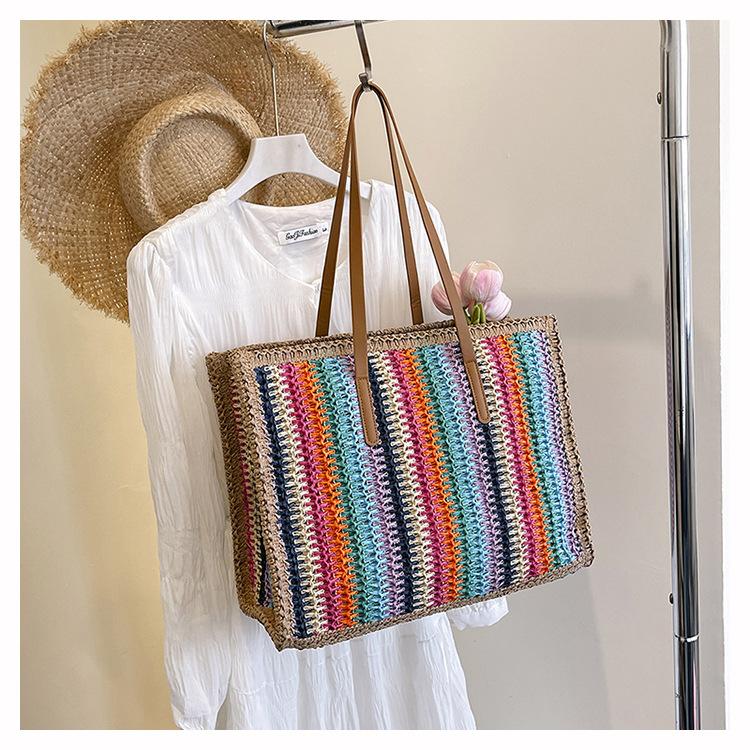 Новая красочная полосатая плетеная вручную сумка большой вместимости, повседневная соломенная сумка для пляжа, для ежедневного использования в отпуске, на плечо хаки