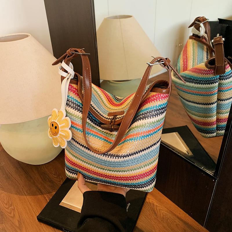 Новая красочная полосатая плетеная сумка кроссбоди сумка-ведро для морского отдыха пляжная соломенная сумка No pendant коричневый