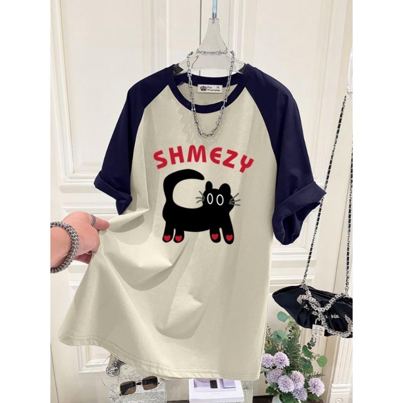 Новая летняя корейская версия мультяшная кошка любовь большая версия свободная контрастного цвета футболка с коротким рукавом реглан для женщин XXXL