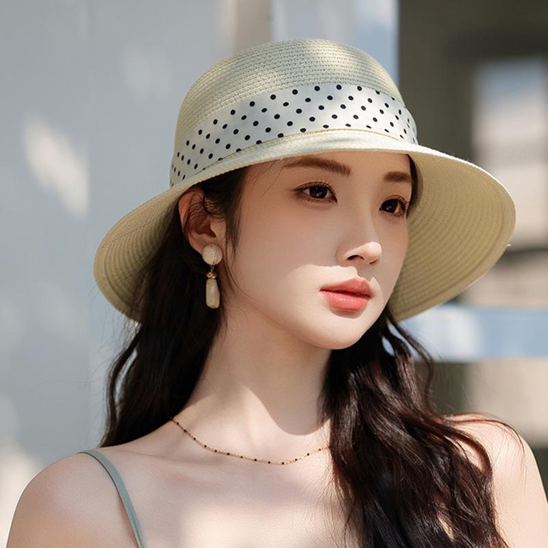 Новая летняя модная соломенная шляпа женская французская в горошек с бантом-лентой солнцезащитная шляпа для пляжа на берегу моря ONE SIZE молочный белый
