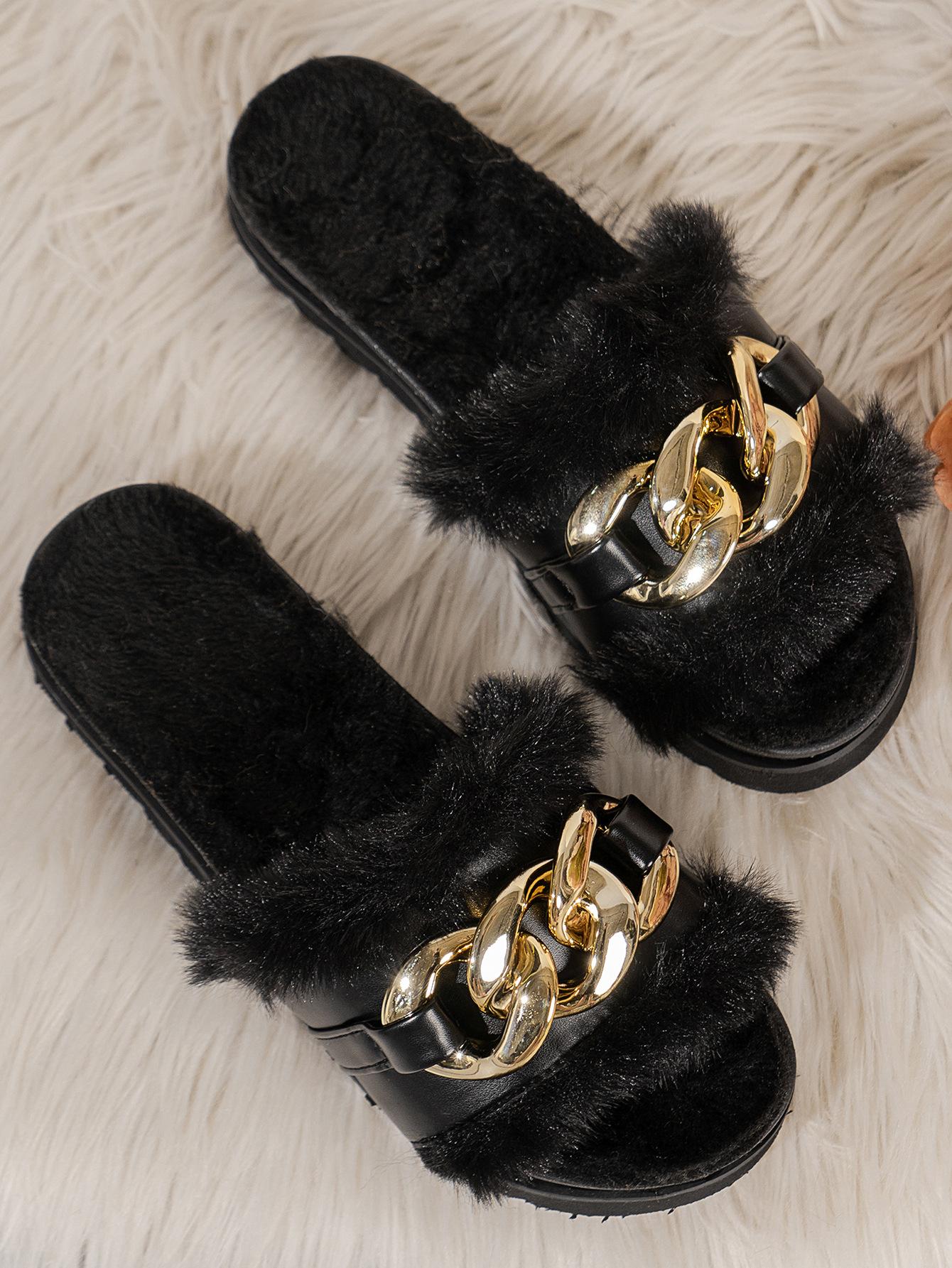 Новая модная открытая пушистая обувь, хлопковые тапочки с металлической цепочкой, женские домашние теплые тапочки для отдыха 43 чёрный