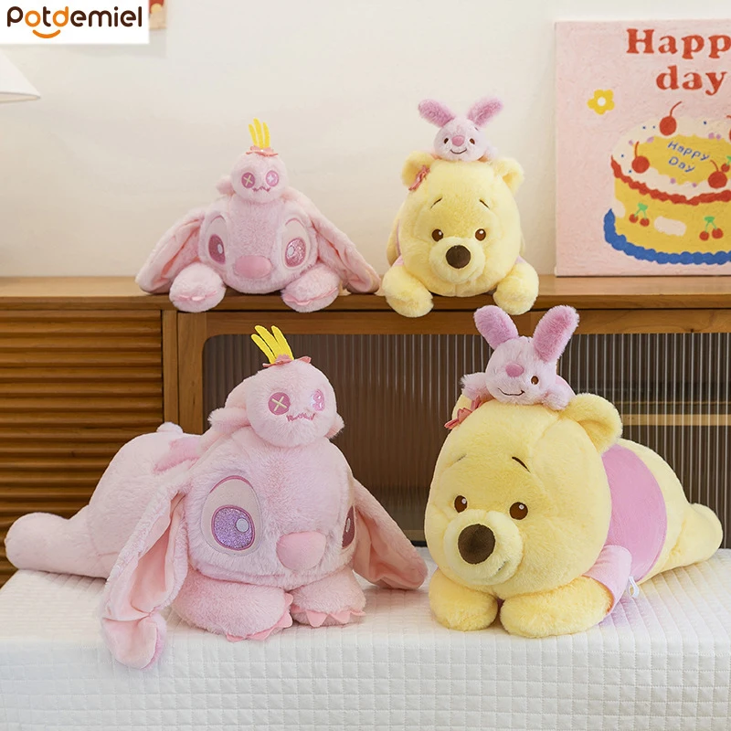 Новая плюшевая игрушка Stitch And Pooh Lying Down, розовая маленькая золотая кукла, милая мультяшная аниме-удобная мягкая подушка для объятий для девочки, подарок на день рождения