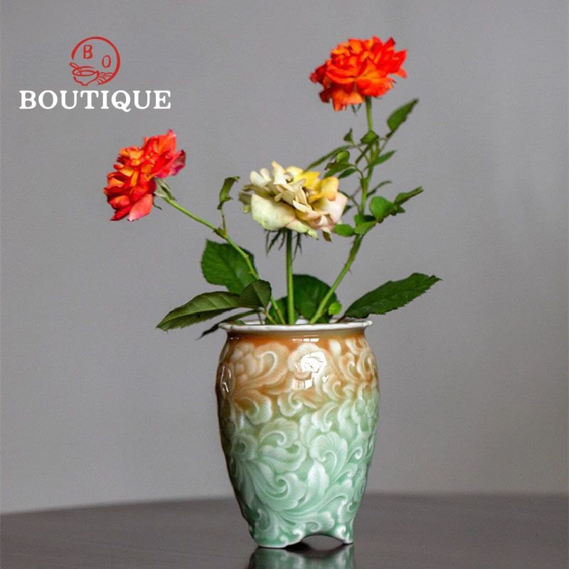 Новая рельефная ваза из селадона в стиле ретро, украшения для чайного столика, ваза с цветочным рисунком для гостиной, Настольная Ваза, укра...