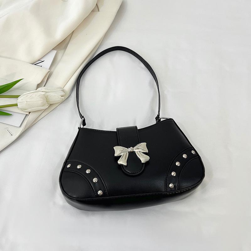 Новая сумка-багет 2025 года, модные заклепки, маленькая квадратная сумка под мышкой, сумка с бантом, женская сумка, сумка на плечо. чёрный