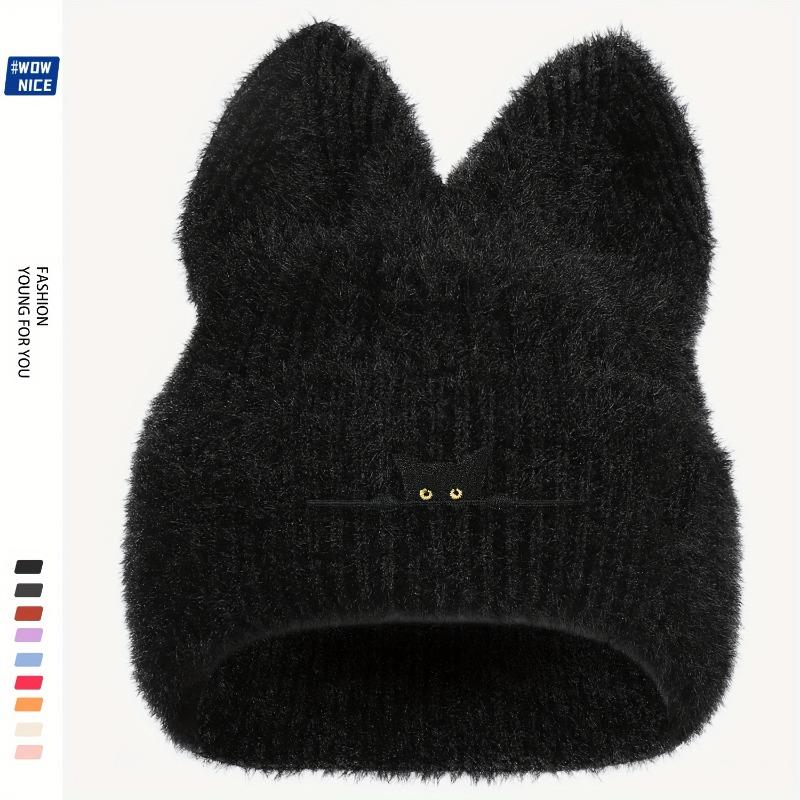 Новая шапка-бини из шерстяного трикотажа с вышивкой кошачьих ушек, милая зимняя теплая шапка для холодной осенней погоды - Унисекс дизайн