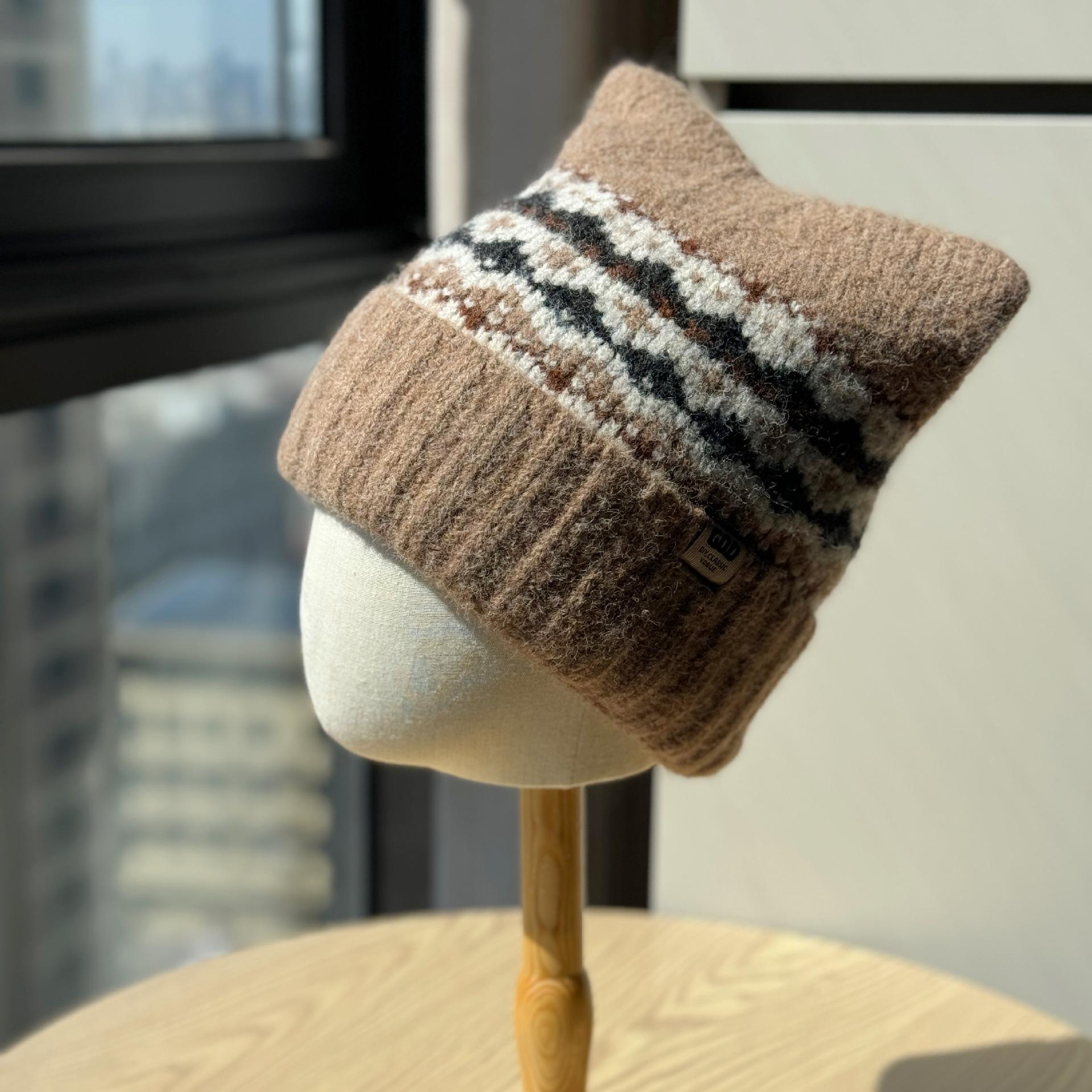 Новая шапка с кошачьими ушками в стиле Fair Isle для женщин, осенне-зимняя, теплая и милая вязаная шапка, цвет красный анкора , с защитой ушей, шерстяная шапка one size
