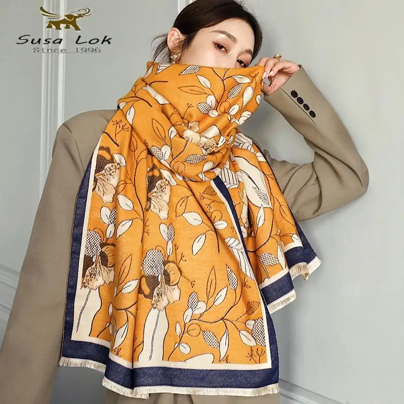Новинка 2022, женский кашемировый зимний шарф с цветочным принтом, Женский фуляр из пашмины, большая Двусторонняя Толстая теплая шаль, пледы