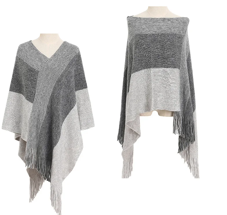 Новинка 2022, осенне-зимняя вязаная шаль, Женская Весенняя многофункциональная женская теплая накидка с кисточками, женское пончо в полоску, серое пончо