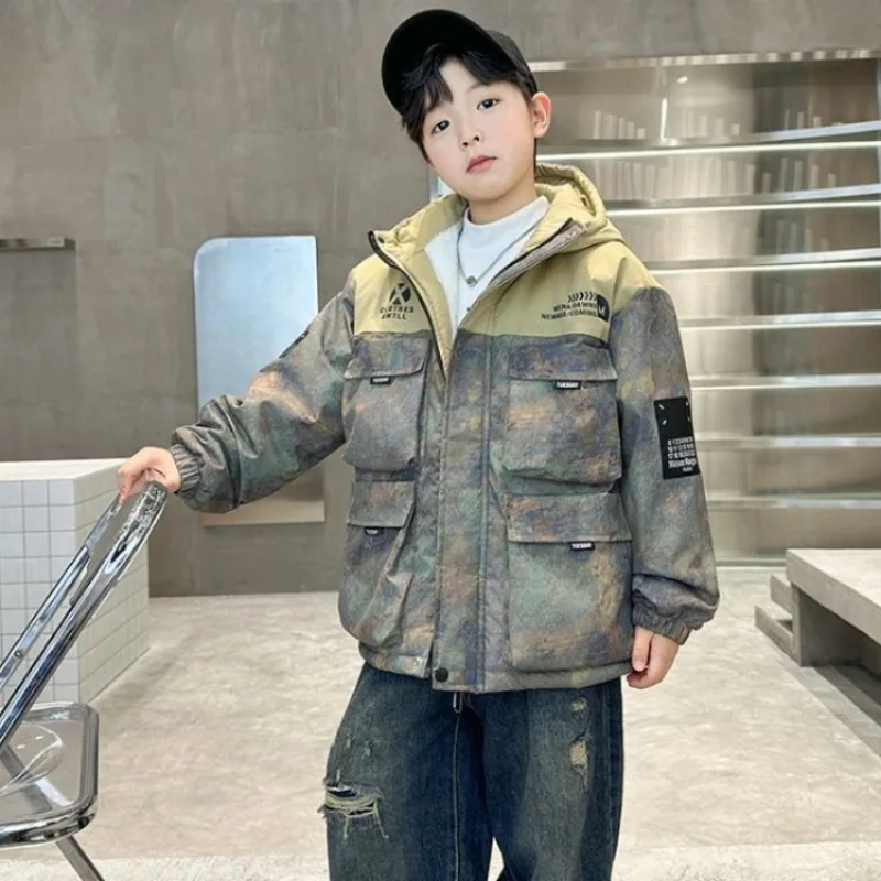 Новинка 2025 года, осенне-зимняя утепленная рабочая одежда на флисовой подкладке для мальчиков, парка с капюшоном, зимнее хлопковое пальто, модная уличная одежда